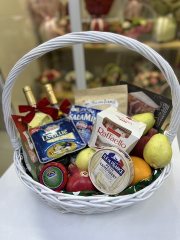 Champagne Moet&Chandon 0.75l, cognac Hennessy VS 0.5l, red caviar 50gr, cheese Brie, cheese Le Bleu, assorted meet antipasto 2 pc, olives 2pcs, nuts, Rafaello, fruits 1 kg.